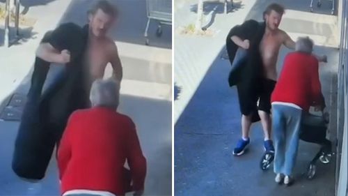 CCTV has captured the moment a shirtless man allegedly knocked an elderly woman unconscious outside a Melbourne shopping centre. (Nine)