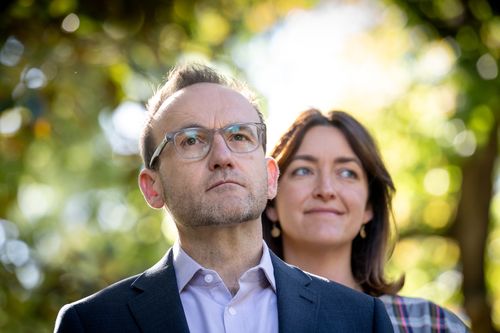 Adam Bandt, Leader of the Australian Greens and Steph Hodgins-May, Greens Senator for Victoria. The Age. Picture: Penny Stephens. Monday 5th May 2025 (PENNY STEPHENS)