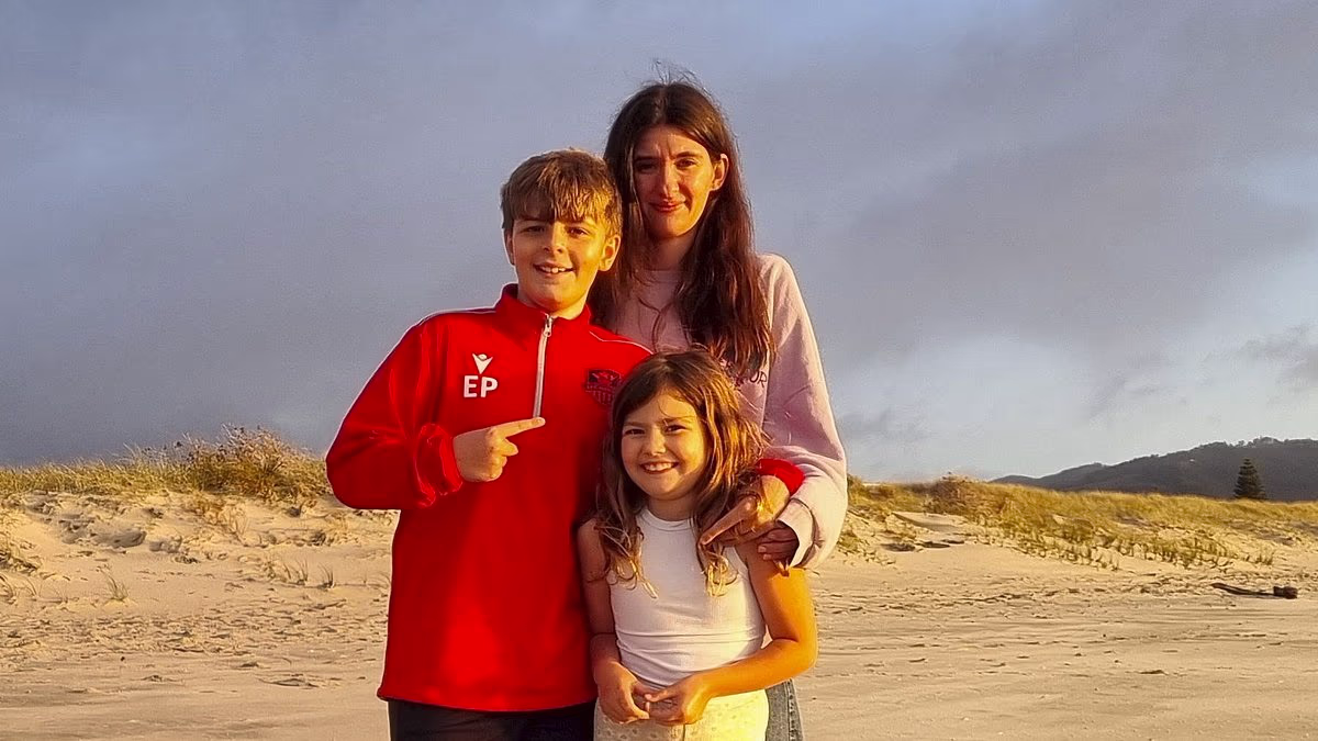 Pictured: Kim with her children Elijah and Willow on a beach in New Zealand after the family moved there in June
