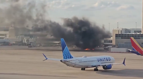 Video captured by a Montana woman waiting for a connecting flight inside the airport shows a large cloud of smoke from the plane rising as dozens of passengers are seen exiting the plane and running away.