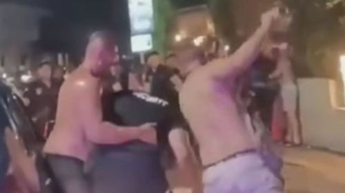 Bali police are seeking a group of tourists over this mass brawl outside a popular night club. (Nine)