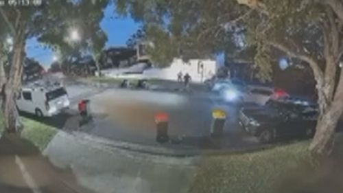 Surveillance video captures a dramatic scene as a white SUV pulls up, and three individuals emerge from the vehicle.