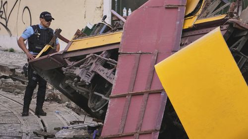 A police officer inspects a wagon at the site where a tourist streetcar derailed and crashed in Lisbon, Portugal, on Thursday, September 4, 2025. (AP Photo/Armando Franca)