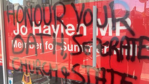 Haylen’s office on Marrickville Road in Marrickville was spraypainted with graffiti yesterday, with the words “antisemite” and “honour your oath seperate [sic] church & state” written on the glass doors.