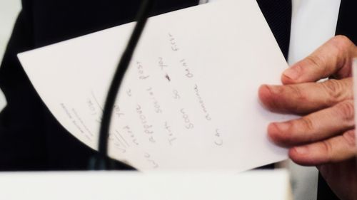 A note passed to Trump asked him to approve a Truth Social post. (AP)