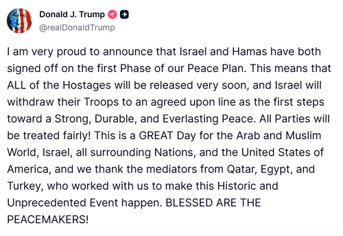 “I am very proud to announce that Israel and Hamas have both signed off on the first Phase of our Peace Plan,” he wrote on Truth Social.