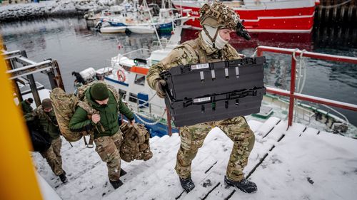Danish soldiers disembark at the harbor in Nuuk, Greenland. (AP)