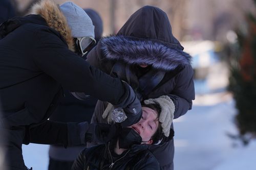 A person gets their eyes washed out after federal immigration officers deploy pepper spray Saturday, Jan. 24, 2026, in Minneapolis. (AP Photo/Abbie Parr) (AP)