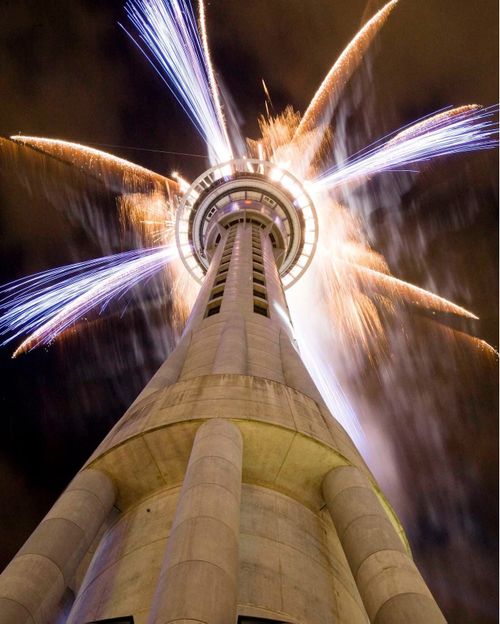 Fireworks shoot out from Auckland’s Sky Tower as midnight strikes in New Zealand. (Sky Tower Auckland)