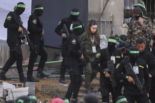 Israeli soldier Arbel Yehoud, 29, who has been held hostage by Hamas in Gaza since October 7, 2023, is escorted by Hamas and Islamic Jihad fighters as she is handed over to the Red Cross in Khan Younis, southern Gaza Strip, Thursday Jan. 30, 2025 (AP Photo/Abdel Kareem Hana)