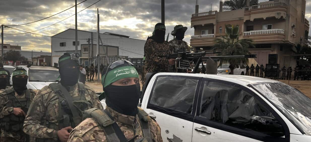 Dozens of masked and armed Hamas fighters deployed in Deir al-Balah, in central Gaza, at the site of the exchange, where hostages were handed over to the International Red Cross Committee, which is transporting them to Israeli forces in Gaza.