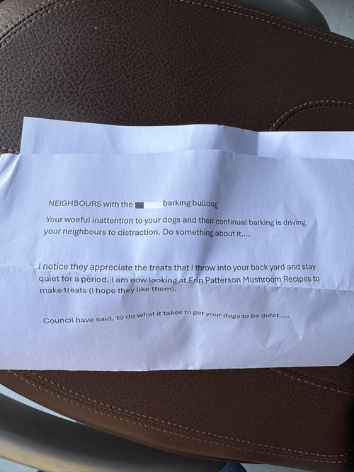 A Sydney mum has revealed an anonymous letter she received, threatening to poison her barking dogs with an “Erin Patterson mushroom recipe”.