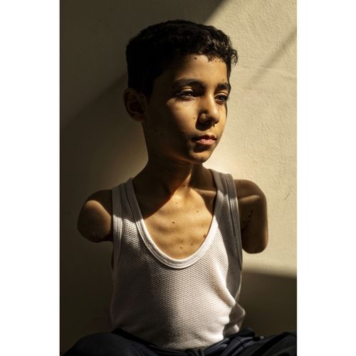The photo, taken by Qatar-based Palestinian photographer Samar Abu Elouf for The New York Times shows nine-year-old Mahmoud Ajjour with his arms missing just below each shoulder.