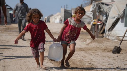 Displaced Palestinians girls carry a jerrycan after collecting water from a distribution point at a tent camp in Muwasi, an area that Israel has designated as a safe zone, in Khan Younis. (AP)