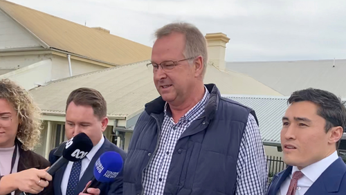 Accused chicken killer Peter Smith (centre) with his defence lawyer Bryan Wrench (right) outside Raymond Terrace Local Court. (Mark Russell/AAP)