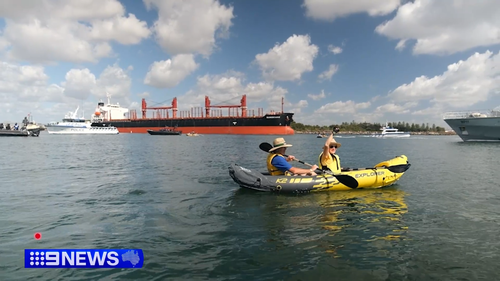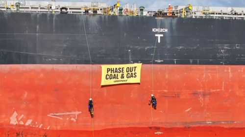 Footage from today showed a banner reading “phase out coal and gas” being unfurled by two people hanging from the side of the vessel. (9News)