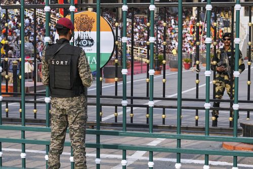 A Pakistani paramilitary soldier, left, and Indian Border Security Forces soldier, right, stand guard on their sides, during a daily closing ceremony at the Wagah, a joint post on the Pakistan and India border, near Lahore, Pakistan, on Saturday, May 3, 2025. (AP Photo/K.M. Chaudary) (AP)