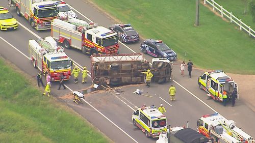 Footage captured by the 9News helicopter shows a marked police van that has come off the road and a truck on its side blocking both lanes of the highway.