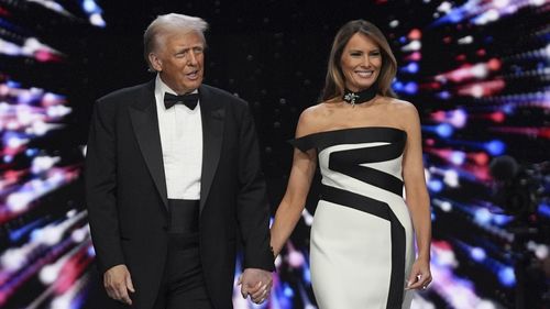 President Donald Trump and first lady Melania Trump arrive at the Liberty Ball, part of the 60th Presidential Inauguration, on January 20, 2025. (AP)