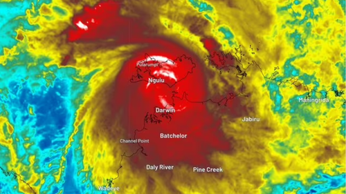 The cyclone is presently situated about 300 km southwest of Darwin and is advancing at a pace of approximately 8 km/h in a southwesterly direction.