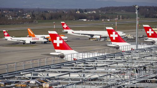 Swiss International Air Lines aircrafts and easyJet aircraft are parked on the tarmac of the Geneve Aeroport due to the coronavirus COVI-19, in Geneva, Switzerland, Tuesday, March 24, 2020. Due to the COVID-19 Coronavirus pandemic a large number of flights of the Swiss carrier and easyJet carrier have been cancelled and part part thier fleet grounding at the airport in Geneva. (KEYSTONE/Salvatore Di Nolfi)