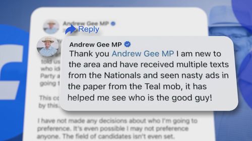 In a Facebook post which called out his former party, the Nationals, one of the top comments praised the politician but the comment appeared to be from Gee’s own account.