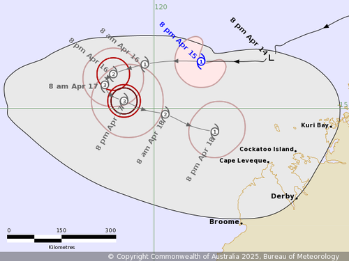 It’s too early for any predictions of landfall but the outer winds could be affecting roughly 400-kilometre stretch of coastline, from just north of Broome to a little north of Kuri Bay, by Friday night.
