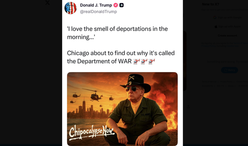 The illustration in Trump’s post shows him against a backdrop of the Chicago skyline, wearing a hat matching that of the movie’s war-loving and amoral Lt. Col. Kilgore, played by Robert Duvall.