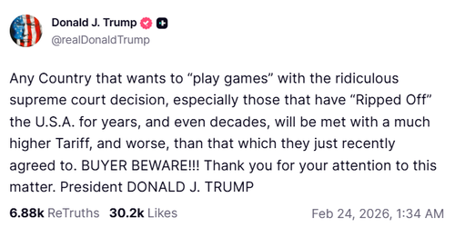 “Any country attempting to ‘play games’ with the recent Supreme Court decision, especially those who have taken advantage of the U.S.A. for years, will face significantly higher tariffs, and even harsher penalties than those agreed upon recently,” he warned.