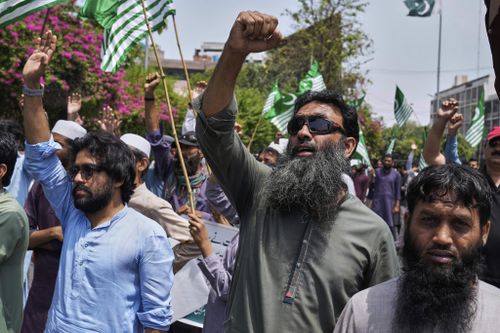 Supporters of the National Conference (NC) Kashmirs ruling party shout anti-Pakistan and anti-militant slogans during a protest against the killing of tourists, on April 23, 2025 in Srinagar, India. (Getty)