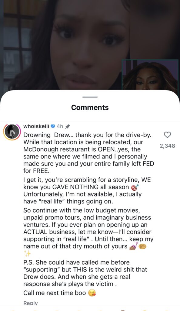 “Drowning Drew… thank you for the drive-by,” she wrote. “While that location is being relocated, our McDonough restaurant is OPEN..yes, the same one where we filmed and I personally made sure you and your entire family left FED for FREE. I get it, you’re scrambling for a storyline, WE know you GAVE NOTHING all season.”