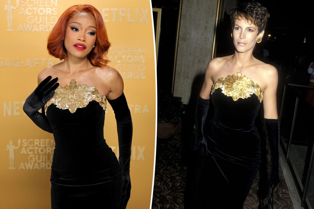 Palmer’s stylist Molly Dickson confirmed the fashion flashback on her Instagram Story, sharing a photo of Curtis sporting the same black velvet strapless style at the First Annual American Cinematheque Award Salute to Eddie Murphy on Feb. 28, 1986.
