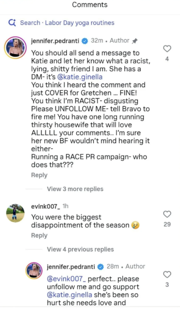 “You should all send a message to Katie and let her know what a racist, lying, sh**ty friend I am. She has a DM – it’s @katie.ginella,” wrote Jennifer, via @thepinkpopbox on Instagram. “You think I heard the comment and just COVER for Gretchen … FINE! You think I’m RACIST – disgusting — Please UNFOLLOW ME – tell Bravo to fire me! You have one long running thirsty housewife that will love ALLLLL your comments.. I’m sure her new BF wouldn’t mind hearing it either – Running a RACE PR campaign – who does that???”