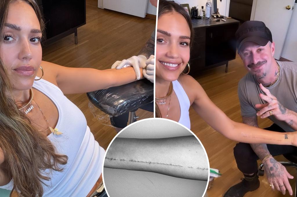 In the first pic, Alba, 43, is seen taking a selfie mid-tat session, wearing a white tank top, green cargo pants and her ever-present “HHH” necklace dedicated to children Honor, Haven and Hayes.