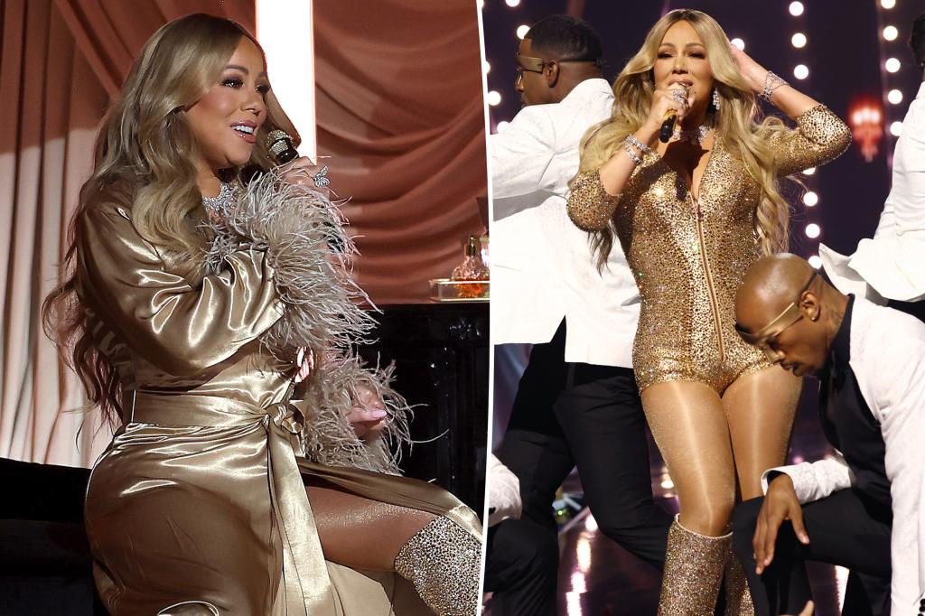 Carey, wearing a gold silk dress, kicked off her performance with “Sugar Sweet.” Then, she belted out her hit “Fantasy” featuring Ol’ Dirty Bastard followed by “Heartbreaker,” during which she unveiled her sparkling gold bodysuit with matching boots.