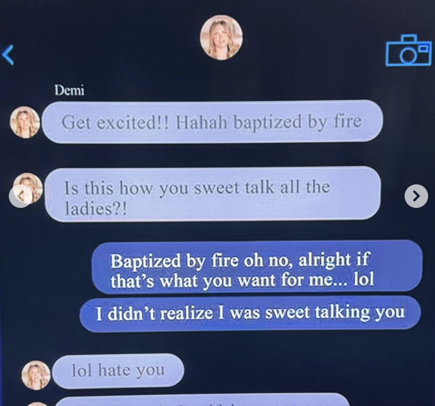 “Get excited!! Hahah baptized by fire,” Demi allegedly wrote in a cryptic message. “Is this how you sweet talk all the ladies?!”
