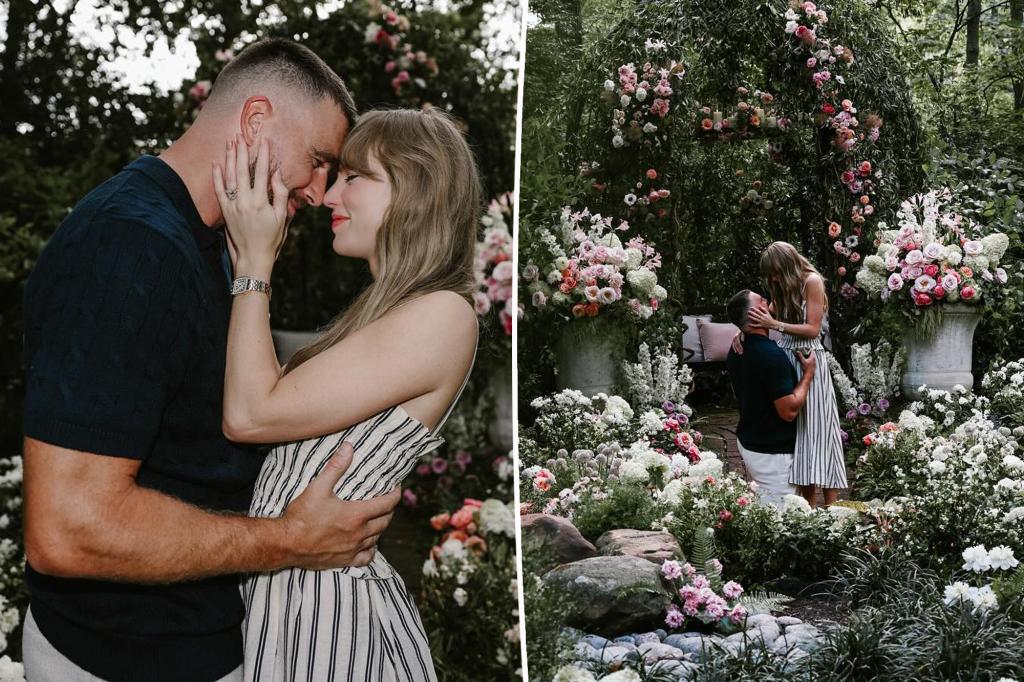 The couple was surrounded by greenery and pink-and-white florals. In other snaps, the singer lovingly cradled Kelce’s face and showed off her glittering new engagement ring — which Page Six Style exclusively revealed could be worth up to $1 million.