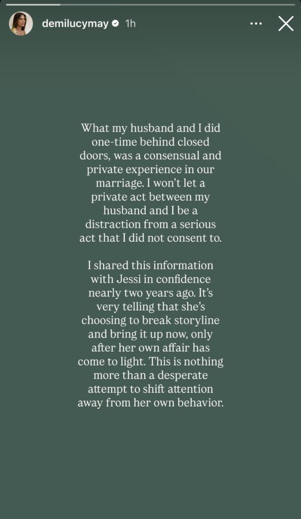 “I shared this information with Jessi in confidence nearly two years ago. It’s very telling that she’s choosing to break storyline and bring it up now, only after her own affair has come to light,” Demi went on. “This is nothing more than a desperate attempt to shift attention away from her own behavior.”