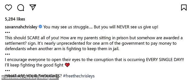 ‘This should SCARE all of you! How are my parents sitting in prison but somehow are awarded a settlement? sign. It’s nearly unprecedented for one arm of the government to pay money to defendants when another arm is fighting to keep them in jail,’ she wrote.