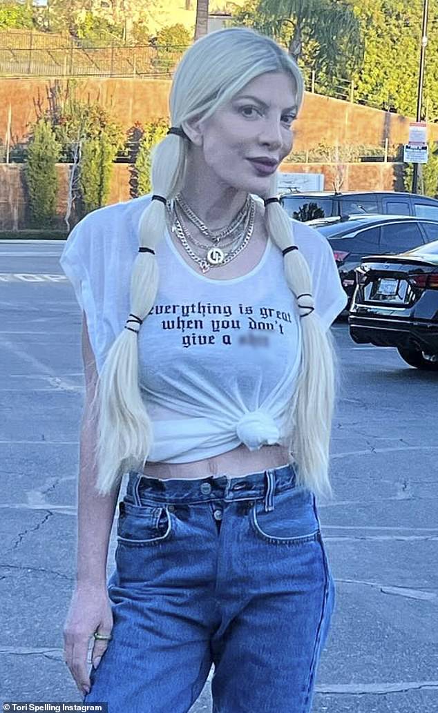 Beverly Hills, 90210 veteran Tori Spelling wore a rude shirt on Wednesday afternoon. The Inn Love star had a sassy top that said, ‘Everything is great when you don’t give a s***’