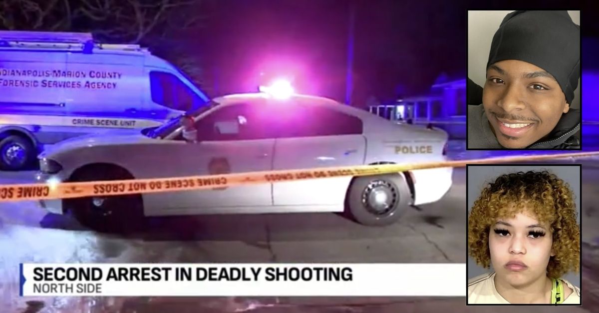 Background: News footage from the scene of the Jan. 25 shooting of Jarrell Pryor (WXIN). Inset (top): Jarrell Pryor (Facebook). Inset (bottom): Alexis Hawkins (Marion County Jail).