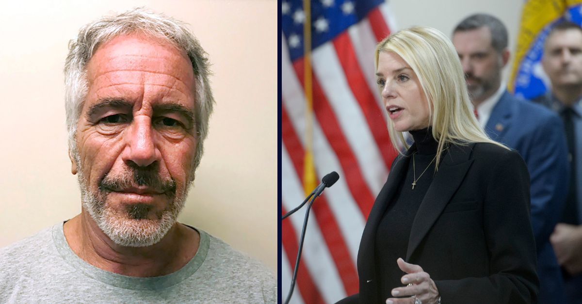 Left: Jeffrey Epstein (New York State Sex Offender Registry via AP, File); Right: Attorney General Pam Bondi speaks during a news conference at the Manassas FBI Field Office, Thursday, March 27, 2025, in Manassas, Va. (AP Photo/Rod Lamkey, Jr.)