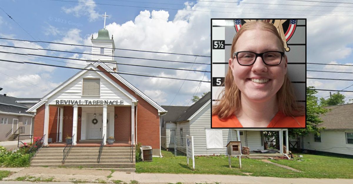 Inset: Sarah Vicker (Madison County Detention Center). Background: The Revival Tabernacle church in Richmond, Kentucky (Google Maps).