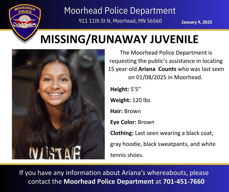 Anyone with information about Ariana’s whereabouts is encouraged to contact the Moorhead Police Department at 701-451-7660.