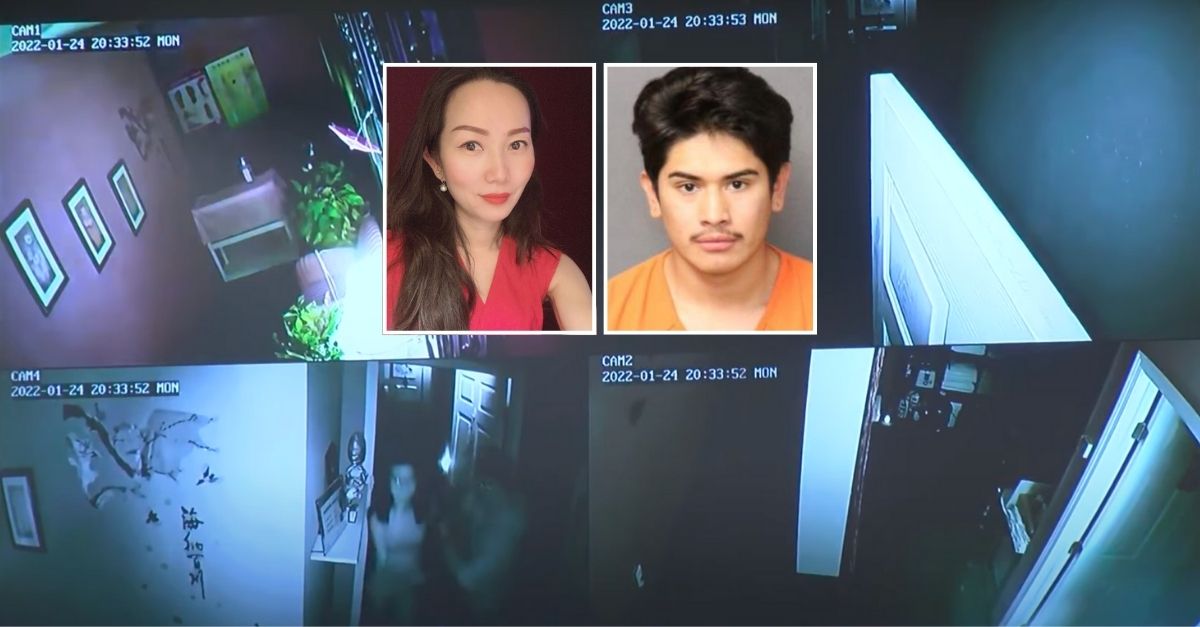 Inset left: Sihui Fang (French Funerals & Cremations). Inset right: Juan Carlos Hernandez (Bernalillo County District Attorney”s Office). Background: Surveillance camera footage from inside Fang’s business shows Hernandez holding her at gunpoint on Jan. 24, 2022, in Albuquerque, New Mexico (KRQE/YouTube).