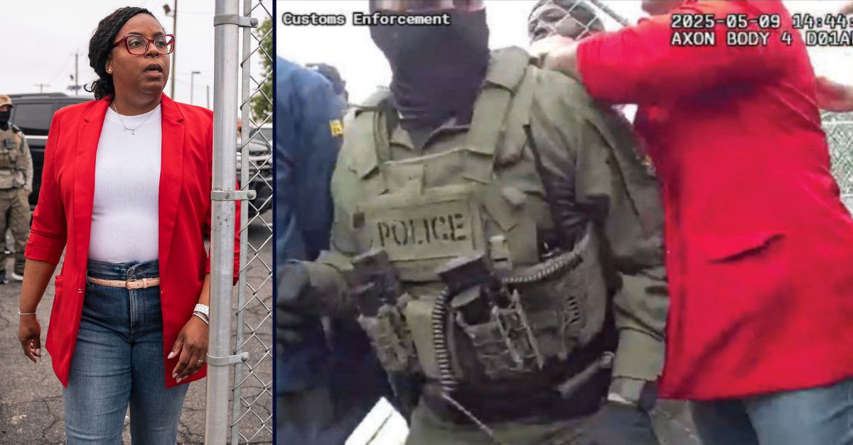 Left: Congresswoman Rep. LaMonica McIver, D-N.J., exits the grounds at Delancey Hall ICE detention prison, Friday, May 9, 2025, in Newark, N.J. (AP Photo/Angelina Katsanis). Right: McIver allegedly making contact with a federal agent (U.S. Department of Justice).