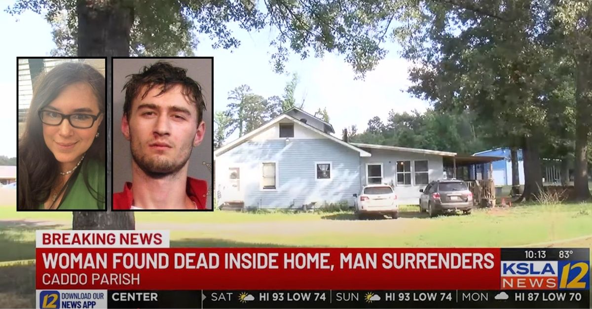 Inset left: Lara Lyons (DeSoto Parish Schools). Inset right: Connor Lyons (Caddo Parish District Attorney”s Office). Background: A home on the 6000 block of Double A Drive in Shreveport, Louisiana (KSLA/YouTube).