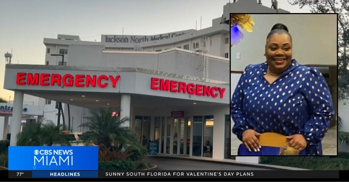 Background: News footage of Jackson North Medical Center in North Miami Beach, Fla., where Tasheba Anderson died (WFOR). Inset: Tasheba Anderson (provided by family).