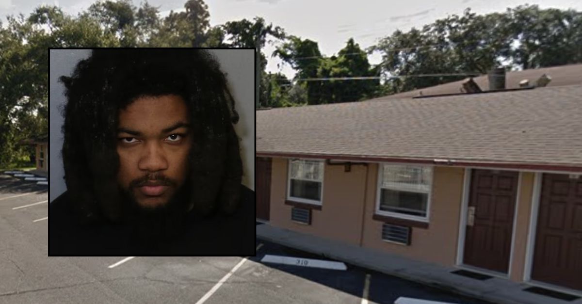 Background: The Knights Inn in Kissimmee, Fla. where Larry Rhodes Jr. killed his son in 2022 (Google Maps). Inset: Larry Rhodes Jr. (Osceola County Sheriff’s Office).