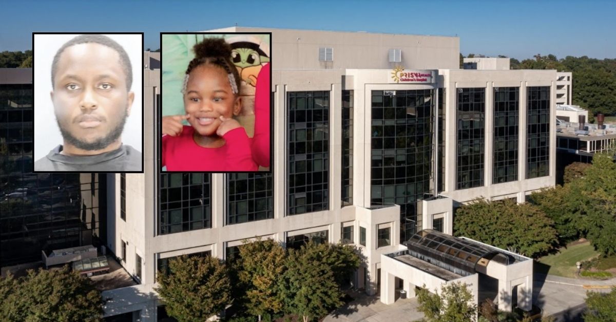 Background: Prisma Health Children’s Hospital in Columbia, S.C., where Hope Fields died in 2024 (Google Maps). Inset (left): Wilbur Fields (Richland County Detention Center). Inset (right): Hope Fields (Richland County Sheriff’s Office).